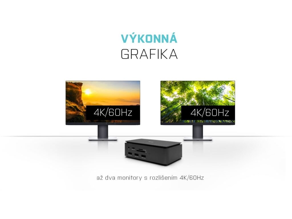 • Kompatibilní s notebooky a tablety s rozhraním USB4, USB-C a Thunderbolt. (Hostitelské zařízení musí podporovat režim DisplayPort Alt).• 1x DisplayPort a 1x HDMI podporující až dva displeje 4K/60Hz nebo jeden displej 8K/30Hz (v závislosti na výkonu hostitelského zařízení). macOS podporuje pouze jeden rozšířený displej.