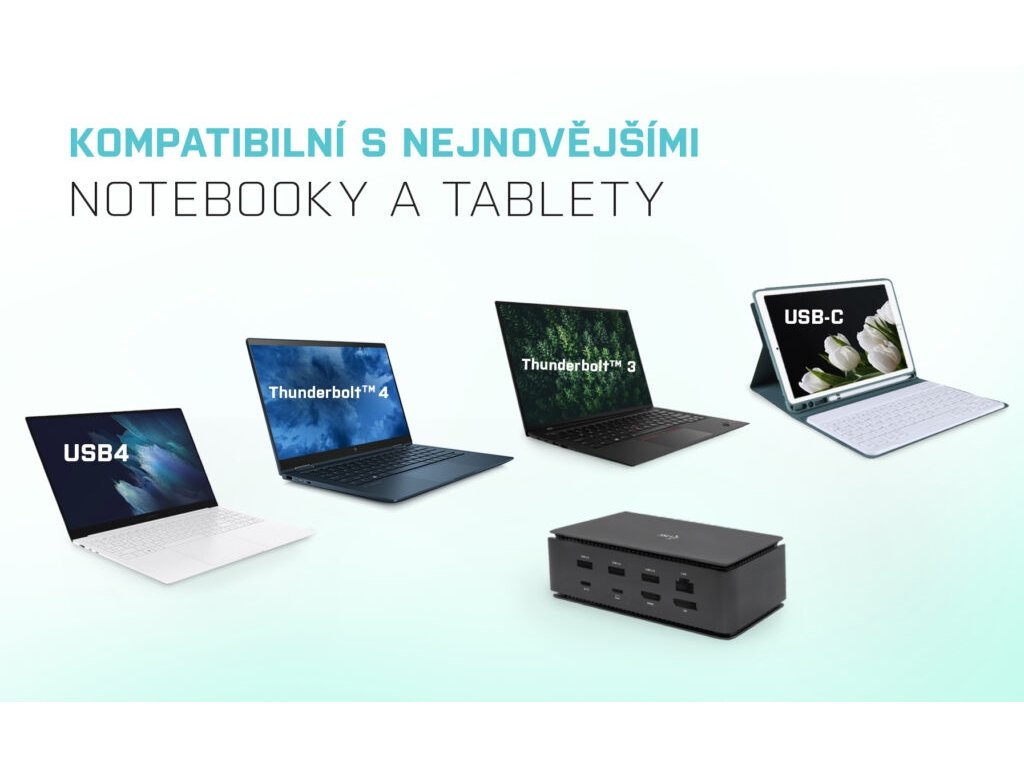 • Vzhledem k tomu, že technologie USB4 je zpětně kompatibilní, tuto dokovací stanici můžete připojit nejen k notebookům a tabletům s portem USB4, ale i ThunderboltTM 3/4 a USB-C (musí podporovat přenos videa). Díky tomu je dokovací stanice ideálním a flexibilním řešením pro firmy a uživatele, kteří provozují notebooky a tablety s různými porty.