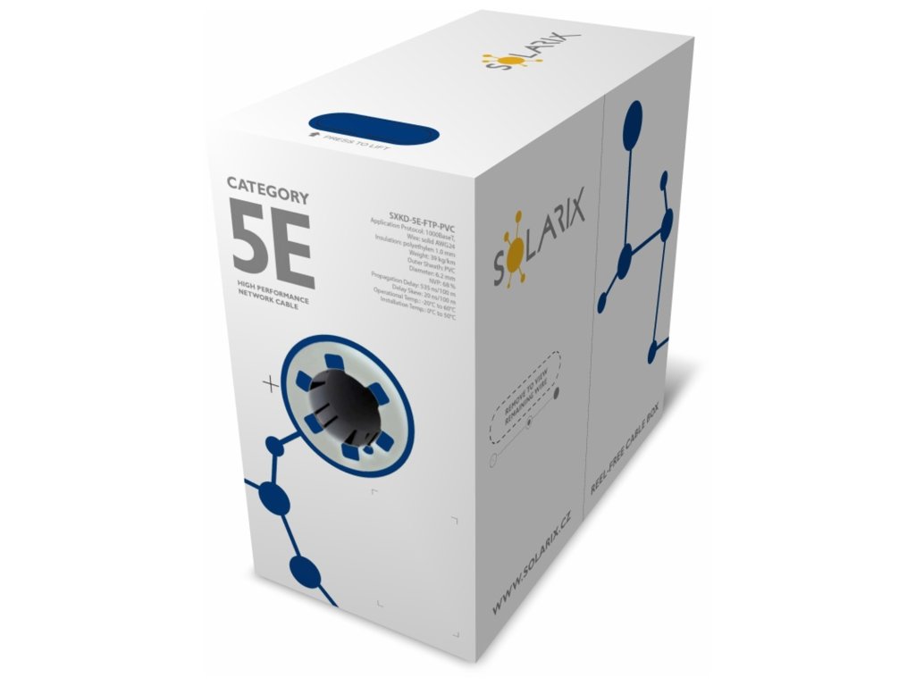 Instalační kabel Solarix s označením SXKD-5E-FTP-PVC je spolehlivý stíněný kabel kategorie 5E, který je určený pro provoz ethernetových protokolů, včetně 2.5GBASE-T a 5GBASE-T*. Konstrukce kabelu je F/UTP, typ pláště PVC s třídou reakce na oheň Eca. Vodiče kabelu jsou vyrobeny z kvalitního měděného drátu s čistotou mědi 99,97 %. Kabel bez problémů splňuje požadavky z mezinárodních standardů ISO/IEC 11801, EN 50173 a ANSI/TIA 568.2-D. Výkonové parametry tohoto kabelu byly otestovány nezávislou testovací zkušebnou FORCE TECHNOLOGY v rámci programu EC Verified, a to na nejvyšší úroveň tzv. Component Level. Certifikát je k dispozici zde na webu v záložce "Odkazy" nebo přímo na stránkách laboratoře FORCE. V případě CPR (nařízení EU č. 305/2011) je kabel testován u nezávislé laboratoře FORCE TECHNOLOGY v systému posuzování vlastností AVCP 3. Stejně jako ostatní kabely Solarix, je i kabel SXKD-5E-FTP-PVC značen metráží po 1 m v rozsahu od 0 do 305 m. Kabel je dodáván ve vysoce odolném třívrstvém leštěném kartónovém boxu (vždy barevně odlišeném podle typu kabelu), na kterém jsou uvedeny všechny nezbytné produktové informace, včetně čárových kódů, výrobní šarže, popisu a nejdůležitějších technických parametrů.Technické parametry
