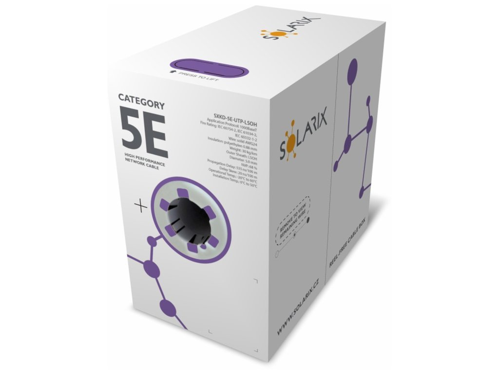 Instalační kabel Solarix s označením SXKD-5E-UTP-LSOH je spolehlivý nestíněný kabel kategorie 5E, který je testován až do šířky pásma 350 MHz, a je určený pro provoz ethernetových protokolů, včetně 2.5GBASE-T a 5GBASE-T*. Konstrukce kabelu je U/UTP, typ pláště LSOH s třídou reakce na oheň Dca-s1,d2,a1. Vodiče kabelu jsou vyrobeny z kvalitního měděného drátu s čistotou mědi 99,97%. Kabel bez problémů splňuje požadavky z mezinárodních standardů ISO/IEC 11801, EN 50173 a ANSI/TIA 568.2-D. Výkonové parametry tohoto kabelu byly otestovány nezávislou testovací zkušebnou FORCE TECHNOLOGY v rámci programu EC Verified, a to na nejvyšší úroveň tzv. Component Level. Certifikát je k dispozici zde na webu v záložce "Odkazy" nebo přímo na stránkách laboratoře FORCE. V případě CPR (nařízení EU č. 305/2011) je kabel testován v systému posuzování vlastností AVCP 3. Stejně jako ostatní kabely Solarix, je i kabel SXKD-5E-UTP-LSOH značen metráží po 1 m v rozsahu od 0 do 305 m. Kabel je dodáván ve vysoce odolném třívrstvém leštěném kartónovém boxu (vždy barevně odlišeném podle typu kabelu), na kterém jsou uvedeny všechny nezbytné produktové informace, včetně čárových kódů, výrobní šarže, popisu a nejdůležitějších technických parametrů.Technické parametry