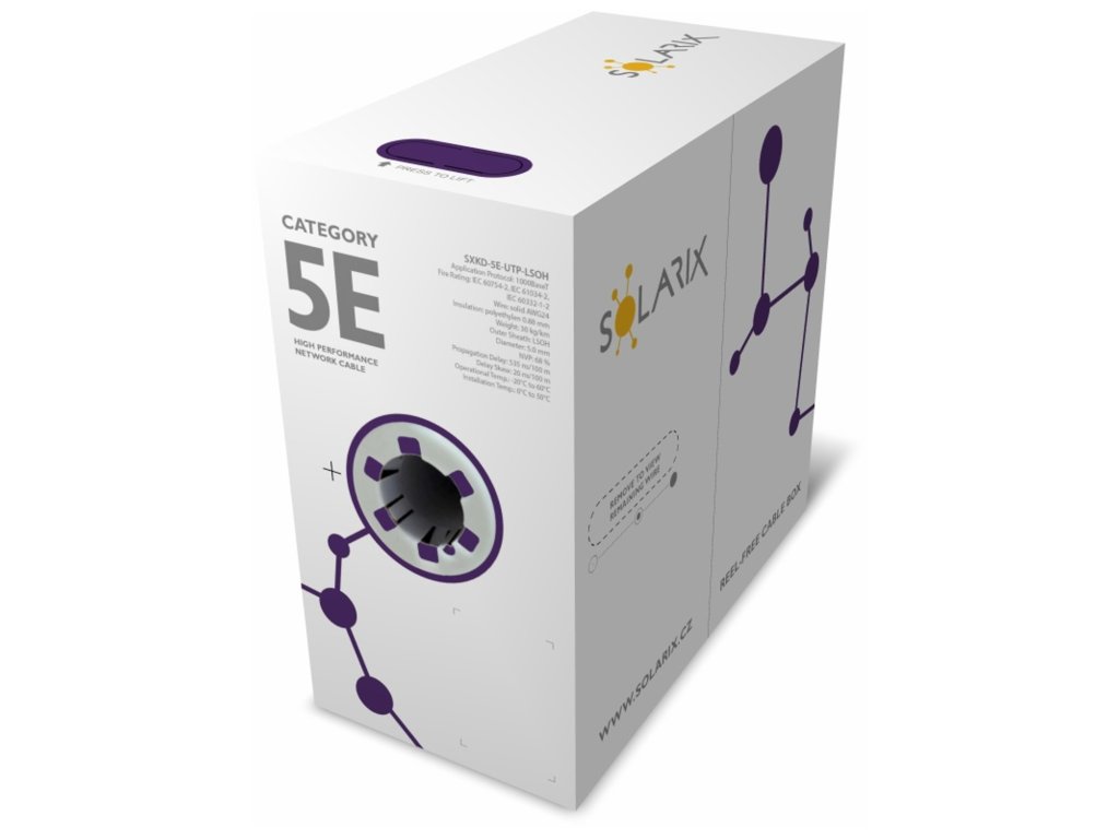 Instalační kabel Solarix s označením SXKD-5E-UTP-LSOH je spolehlivý nestíněný kabel kategorie 5E, který je testován až do šířky pásma 350 MHz, a je určený pro provoz ethernetových protokolů, včetně 2.5GBASE-T a 5GBASE-T*. Konstrukce kabelu je U/UTP, typ pláště LSOH s třídou reakce na oheň Dca-s1,d2,a1. Vodiče kabelu jsou vyrobeny z kvalitního měděného drátu s čistotou mědi 99,97%. Kabel bez problémů splňuje požadavky z mezinárodních standardů ISO/IEC 11801, EN 50173 a ANSI/TIA 568.2-D. Výkonové parametry tohoto kabelu byly otestovány nezávislou testovací zkušebnou FORCE TECHNOLOGY v rámci programu EC Verified, a to na nejvyšší úroveň tzv. Component Level. Certifikát je k dispozici zde na webu v záložce "Odkazy" nebo přímo na stránkách laboratoře FORCE. V případě CPR (nařízení EU č. 305/2011) je kabel testován v systému posuzování vlastností AVCP 3. Stejně jako ostatní kabely Solarix, je i kabel SXKD-5E-UTP-LSOH značen metráží po 1 m v rozsahu od 0 do 500 m. Kabel je dodáván ve vysoce odolném třívrstvém leštěném kartónovém boxu (vždy barevně odlišeném podle typu kabelu), na kterém jsou uvedeny všechny nezbytné produktové informace, včetně čárových kódů, výrobní šarže, popisu a nejdůležitějších technických parametrů.Technické parametry