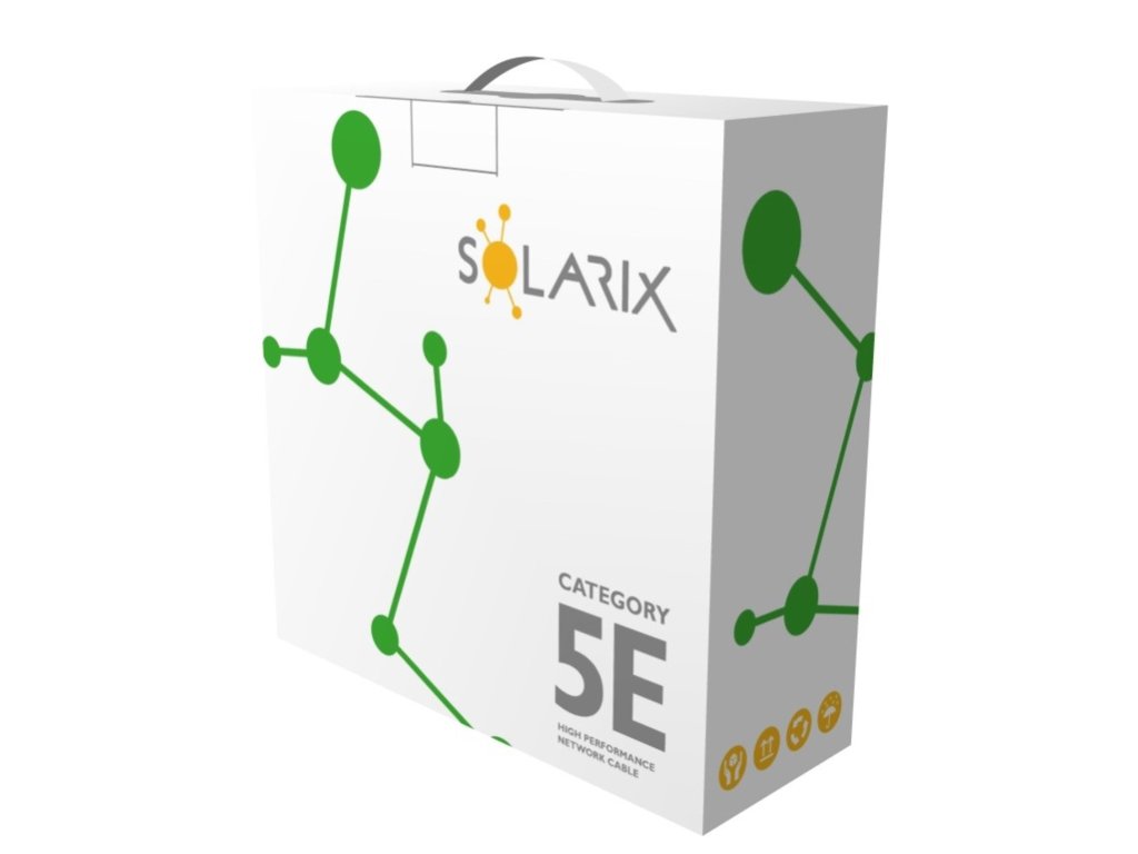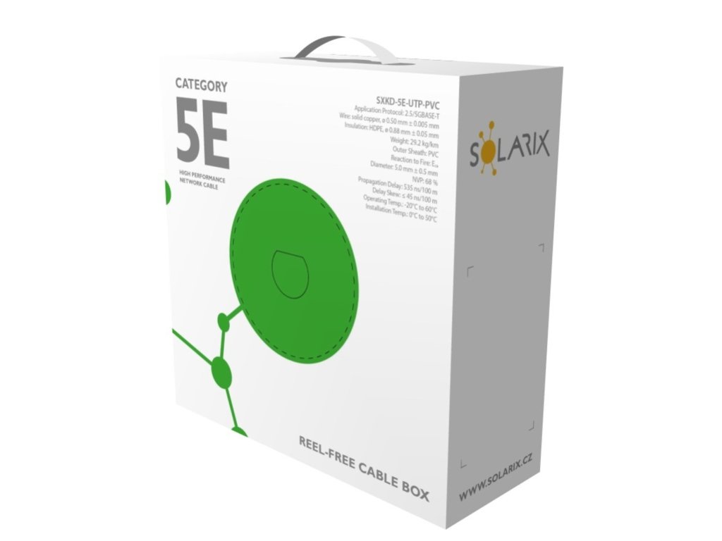 POZOR, nový 100 m box. Instalační kabel Solarix s označením SXKD-5E-UTP-PVC je spolehlivý nestíněný kabel kategorie 5E, který je určený pro provoz ethernetových protokolů, včetně 2.5GBASE-T a 5GBASE-T*. Konstrukce kabelu je U/UTP, typ pláště PVC s třídou reakce na oheň Eca. Vodiče kabelu jsou vyrobeny z kvalitního měděného drátu s čistotou mědi 99,97 %. Kabel bez problémů splňuje požadavky z mezinárodních standardů ISO/IEC 11801, EN 50173 a ANSI/TIA 568.2-D. V případě CPR (nařízení EU č. 305/2011) je kabel testován u nezávislé laboratoře FORCE TECHNOLOGY v systému posuzování vlastností AVCP 3. Stejně jako ostatní kabely Solarix, je i kabel SXKD-5E-UTP-PVC značen metráží po 1 m v rozsahu od 0 do 100 m. Kabel je dodáván ve vysoce odolném třívrstvém leštěném kartónovém boxu (vždy barevně odlišeném podle typu kabelu), na kterém jsou uvedeny všechny nezbytné produktové informace, včetně čárových kódů, výrobní šarže, popisu a nejdůležitějších technických parametrů.Technické parametry