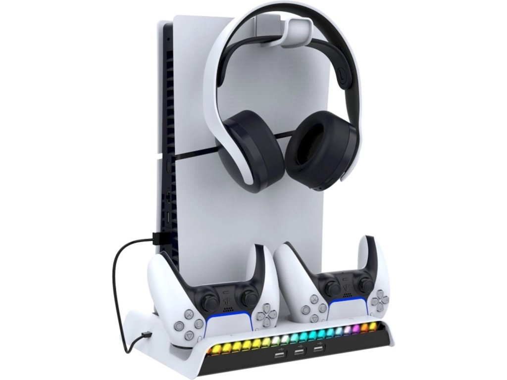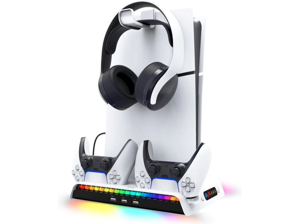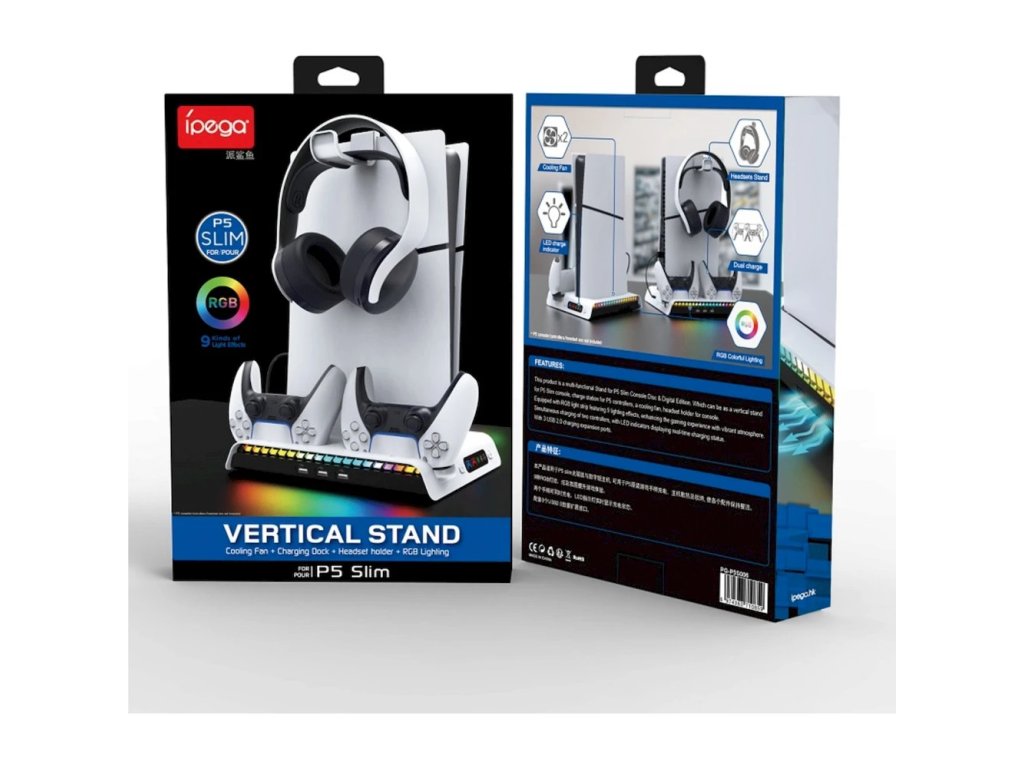 Nabíjecí stanice iPega pro Playstation 5 Slim (CD/Digital) s RGB podsvícením, aktivním chladícím systémem, držákem pro sluchátka a trojicí USB-A portů. Dokáže nabíjet dva DualSense ovladače a díky barevným ikonkám zobrazuje jejich aktuální stav baterie.Nabíjecí stanice pro PlayStation 5 Slim s aktivním chlazením, RGB podsvícením, držákem na sluchátka, USB porty a nabíjecími kolébkami pro dva ovladače DualSense. Díky minimalistickému designu, ladící s herní konzolí, doplní váš herní koutek a zajistí vám stálé místo pro odkládání herních ovladačů. Stanice je vybavena stylovým RGB podsvícením, ve kterém se kombinuje 9 barevných odstínů. Podsvícení lze samozřejmě vypnout pomocí tlačítka na dokovací stanici.