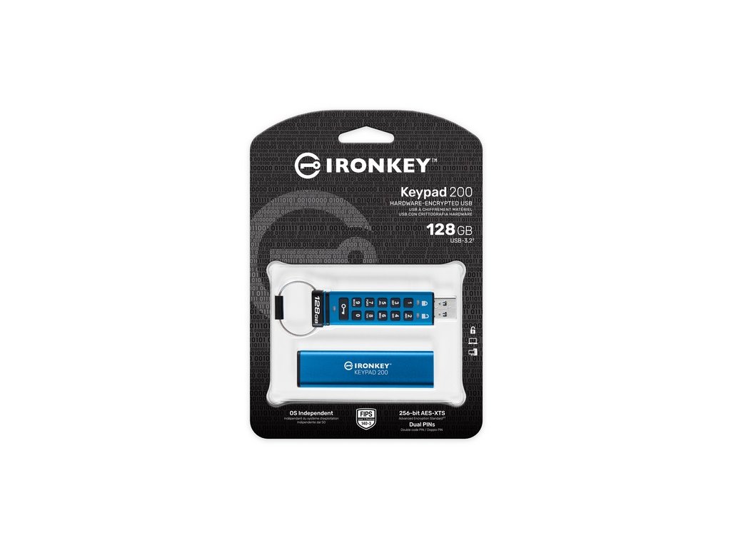 Řada Kingston IronKey™ Keypad 200 jsou na operačním systému nezávislé, hardwarově šifrované disky s rozhraním USB typu A a USB Type-C®* s alfanumerickou klávesnicí pro snadný přístup pomocí PIN kódu.KP200 využívá 256bitové hardwarové šifrování XTS-AES. Má také certifikaci FIPS 140-3 Level 3 (čeká na schválení) pro zabezpečení na armádní úrovni s vylepšeními, která dále zvyšují laťku ochrany dat. Jeho obvody jsou pokryty vrstvou speciálního epoxidu, která prakticky znemožňuje odstranění součástek bez jejich poškození. Tento houževnatý epoxid chrání polovodičové součástky před fzyickým útokem. Disk je navržen tak, aby neoprávněná manipulace byla ihned zřejmá a vlastníci tak byli upozorněni. Zahrnuje také ochranu proti útoku na heslo hrubou silou a ochranu BadUSB s digitálně podepsaným firmwarem. Alfanumerická klávesnice je potažena vrstvou polymeru, která klávesy chrání a zároveň neumožňuje analýzu otisků prstů na tlačítkách, čímž skrývá jejich použití.