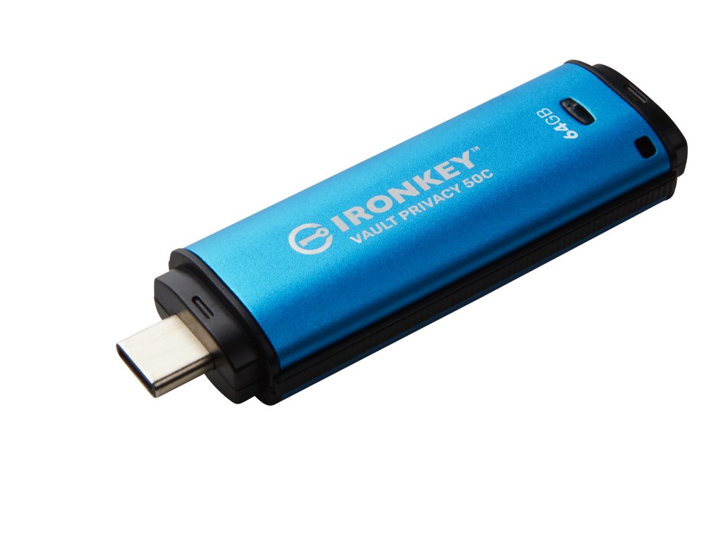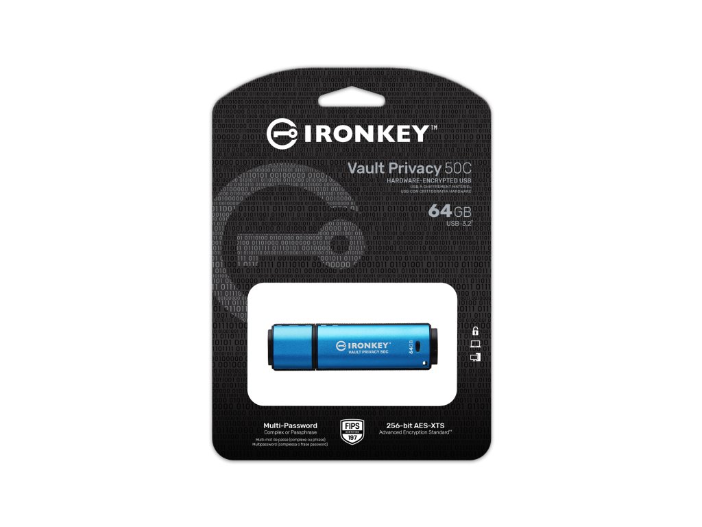 Kingston IronKey™ Vault Privacy řady 50C jsou špičkové disky USB Type-C®, které zajišťují zabezpečení Enterprice-Grade úrovně pomocí 256bitového hardwarového šifrování AES s certifikací FIPS 197 v režimu XTS, včetně zabezpečení proti BadUSB pomocí digitálně podepsaného firmwaru a ochrany proti útoku na heslo hrubou silou. Na VP50 byly provedeny zkoušky prolomení pro zabezpečení na Enterprice-Grade úrovni Vzhledem k tomu, že se jedná o šifrované úložiště pod fyzickou kontrolou uživatele, je řada VP50 při ochraně dat lepší než používání internetu a cloudových služeb.Úložiště Vault Privacy 50 podporuje možnost více hesel (admin, uživatel a jednorázové obnovení) s režimy fráze nebo komplexního přístupového hesla. To zlepšuje možnosti obnovení přístupu k datům, pokud je zapomenuto jedno z hesel. Tradiční režim komplexního hesla umožňuje tvorbu hesel v délce 6–16 znaků s využitím 3 ze 4 znakových sad. Režim přístupového hesla fráze umožňuje využití číselného kódu PIN, věty, seznamu slov nebo zapamatovatelného citátu v délce 10 až 64 znaků. Správce může povolit uživatele a heslo pro jednorázové obnovení nebo resetovat heslo uživatele pro obnovení přístupu k datům. Pro usnadnění zadávání hesla lze aktivovat symbol „oka“, který odkryje zadávané heslo, čímž se omezí překlepy vedoucí k neúspěšným pokusům o přihlášení. Ochrana proti útokům hrubou silou zablokuje uživatelská hesla nebo hesla pro jednorázovou obnovu po 10 neplatných heslech zadaných v řadě a šifrovaně vymaže disk, pokud je heslo správce 10× za sebou zadáno nesprávně.