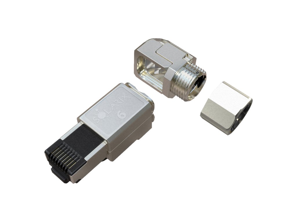 Samořezný úhlový konektor Solarix s označením SXRJ45-6A-STP-BK-SA-U je univerzální průmyslový konektor RJ45, který je určen pro kabely typu drát i licna a je vhodný i pro použití v MPTL (Modular Plug Terminated Link) topologii. Vyznačuje se snadnou a rychlou instalací, ke které nejsou potřeba krimpovací kleště. Vysoká spolehlivost a robustní kovové provedení tohoto konektoru umožňuje jeho použití i v náročných podmínkách. Tento konektor Solarix bez problémů splňuje všechny požadavky definované v mezinárodních standardech ANSI/TIA 568, ISO/IEC 11801 a EN 50173 pro kategorii 6A a třídu vedení Class Ea, včetně všech nejnovějších dodatků. Samořezný konektor Solarix kategorie 6A lze použít k zakončení kabelů s celkovým průměrem až 8,0 mm s vodiči AWG 26-23 až do průměru 1,50 mm (včetně PE izolace). Konektor je rozebiratelný a je určen i pro opakované použití. Jeho výhodou je možnost nasměrování zakončeného kabelu do 4 různých stran pod úhlem 90° (tj. nahoru, dolů, doleva a doprava).Technické parametry