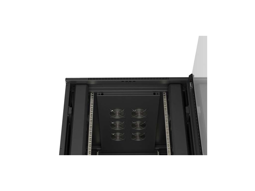 Díky zabudování ventilačního otvoru v horní části konstrukce zajišťuje každý z našich stojanů vynikající proudění vzduchu, což vede k účinnému chlazení. Tento prvek v kombinaci s vestavěnými ventilátory zaručuje kontrolu teploty uvnitř skříně, což je zásadní pro zachování optimálních provozních podmínek pro vaše zařízení.