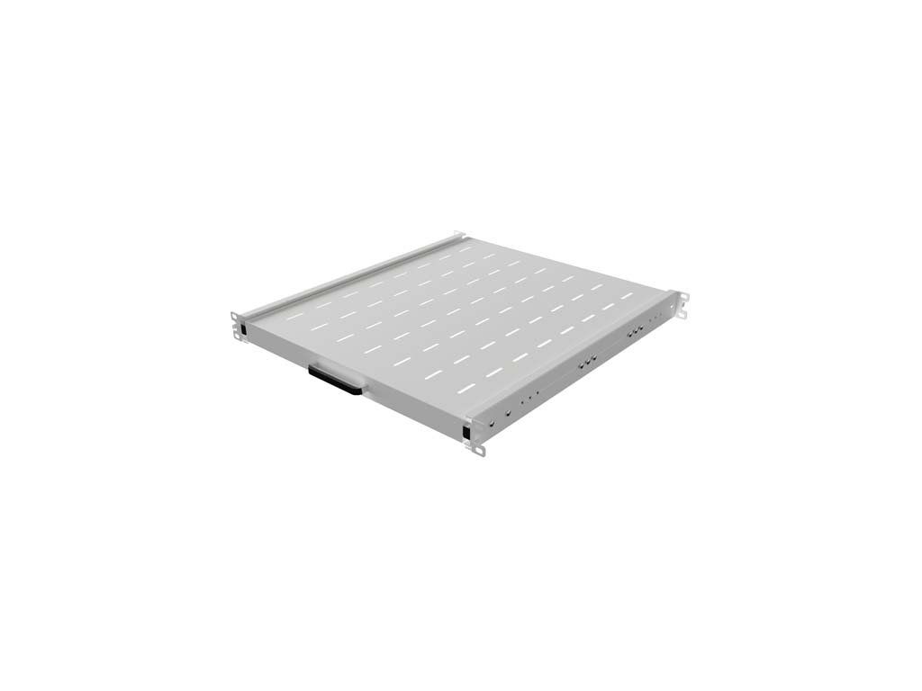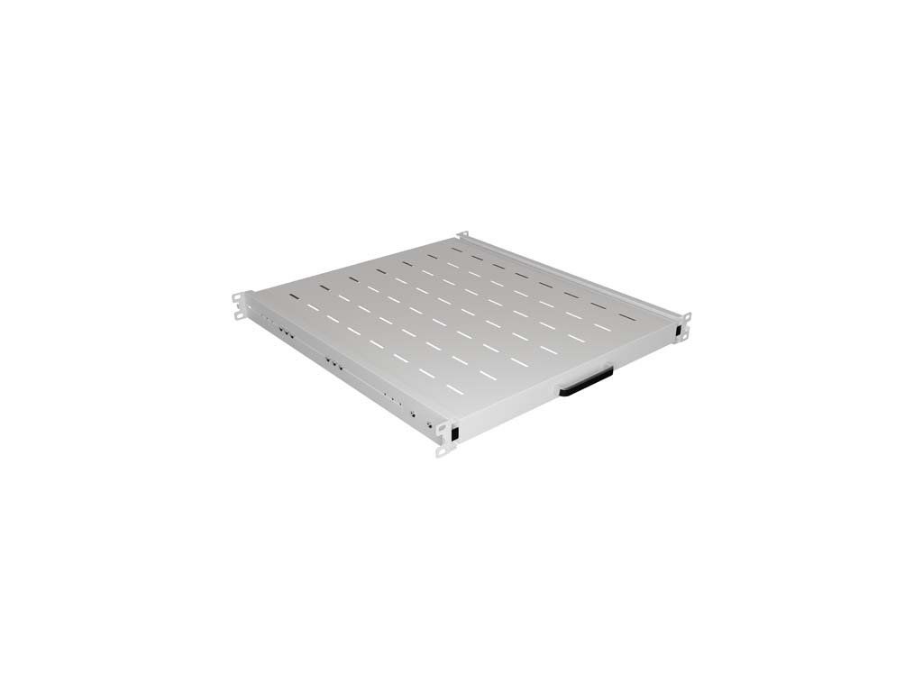 Stabilitu regálu zajišťuje čtyřbodový montážní systém, který dodává celé konstrukci dostatečnou tuhost a spolehlivost. Nastavitelné montážní konzoly usnadňují instalaci do skříní různých hloubek, což z ní činí univerzální a flexibilní řešení, které lze přizpůsobit konkrétním konfiguracím. Praktické otvory v povrchu police umožňují snadné vedení kabelů a podporují cirkulaci vzduchu a odvod tepla ze zařízení. Další výhodou je speciální rukojeť, která umožňuje snadné a bezproblémové vyjmutí zásuvky z rackové skříně, což zvyšuje funkčnost celého systému.