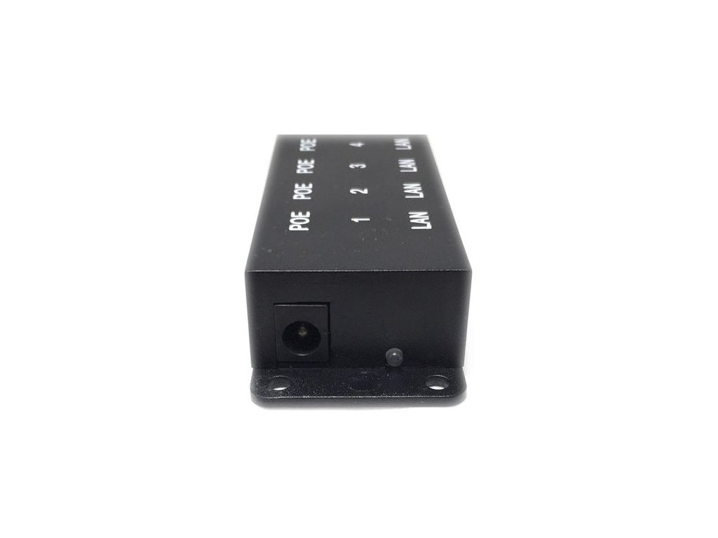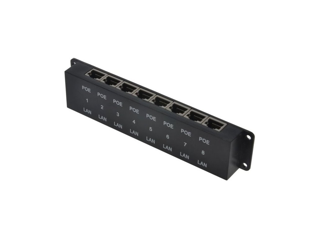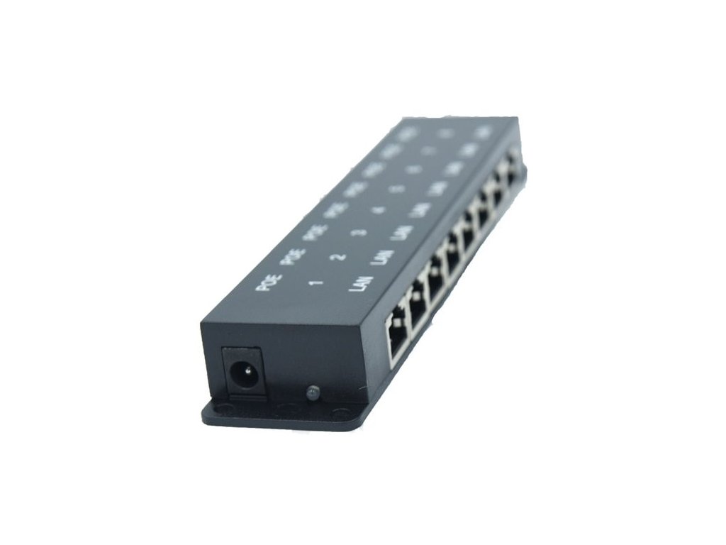 Popis produktuPoE injektor je vhodný pro napájení až osmi zařízení. Do konektorů na jedné straně se připojují ethernetové porty bez napájení např. switch, na opačnou stranu se připojují zařízení využívají pasivní PoE - napájení po eth. kabelu. K napájení se využívají dva nepoužité páry ethernetového kabelu: 4,5 (kladný pól) a 7,8 (záporný pól). Napájení se připojuje standardním napájecím konektorem o velikosti 2.1/5.5mm.