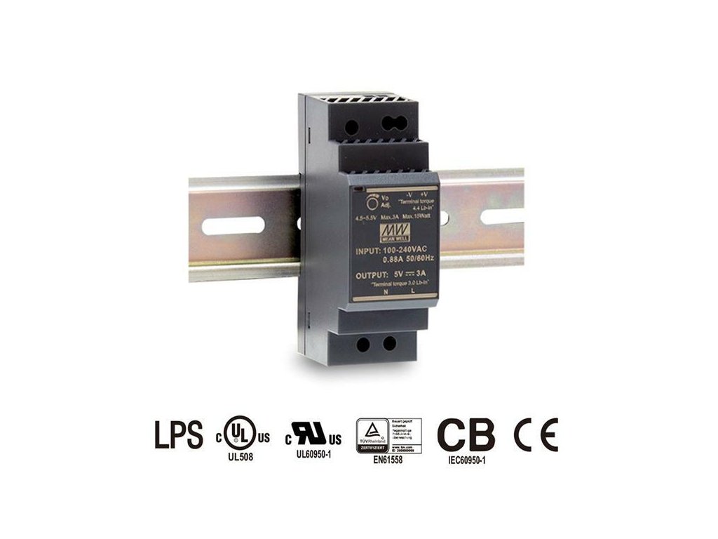 Zdroj na DIN lištu, Inovovananá modelová řada DR-x-x, menší rozměry.Je vhodný pro použití v průmyslových i domácích kontrolních systémech, automatizaci budov, automatizaci výroby a elektromechanických přístrojích.