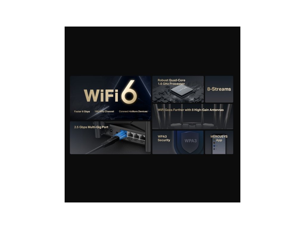 MR90XMR90X AX6000 Dual-Band Wi-Fi 6 RouterSPEED: 1148 Mbps at 2.4 GHz + 4804 Mbps at 5 GHz SPEC: 8× Fixed External Antennas, 1× 2.5 Gbps Port (WAN/LAN auto-sensing), 1× Gigabit Port (WAN/LAN auto-sensing), 2× Gigabit LAN Ports, 1024-QAM, OFDMA, HE160FEATURE: MERCUSYS APP, Router/Access Point Mode, WPS/Reset Button, IPTV, IPv6, Smart Connect, Beamforming, MU-MIMO, Parental Controls, Guest Network, Qos, VPN Server, DFS, WPA3, BSS Color, TWT, TR-069, ISP Preset (Agile Config), Aginet ACS, Superadmin, EasyMesh