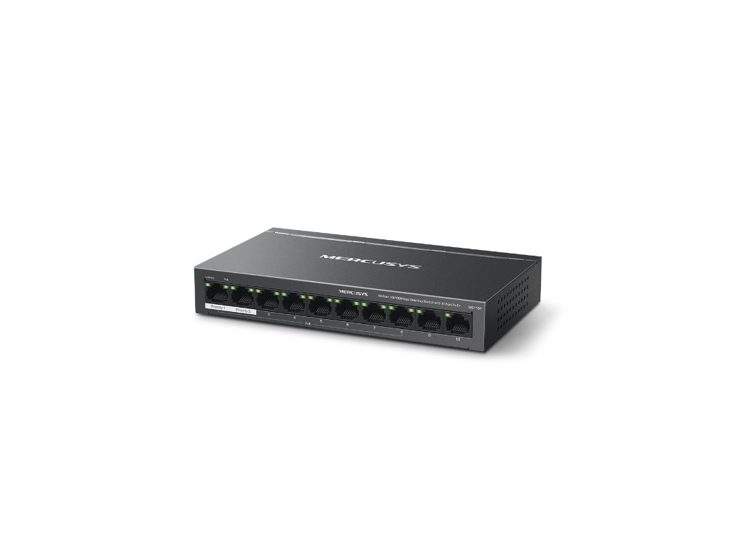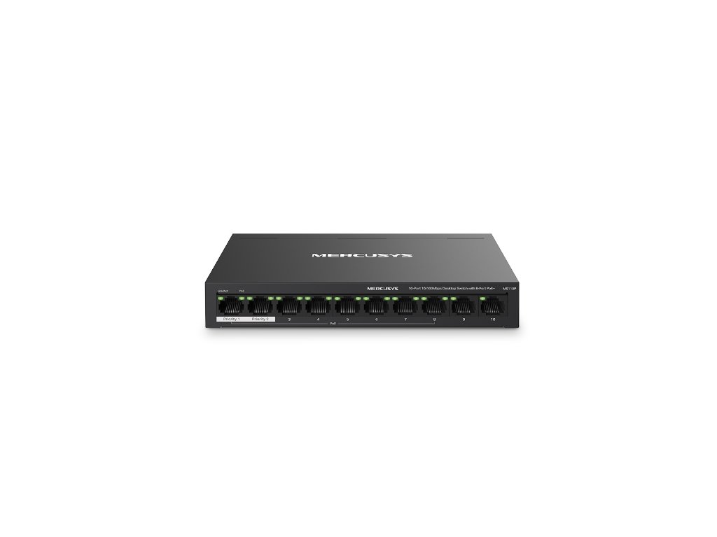 MS110P 10-Port 10/100Mbps Desktop Switch with 8-Port PoE+PORT: 8× 10/100 Mbps PoE+ Ports, 2× 10/100 Mbps Non-PoE PortsSPEC: Compatible with 802.3af/at PDs, 65 W PoE Power, Desktop Steel Case, Wall MountingFEATURE: Extend Mode for 250m PoE Transmitting, Priority Port1-2, Isolation Mode, PoE Auto Recovery, Plug and Play