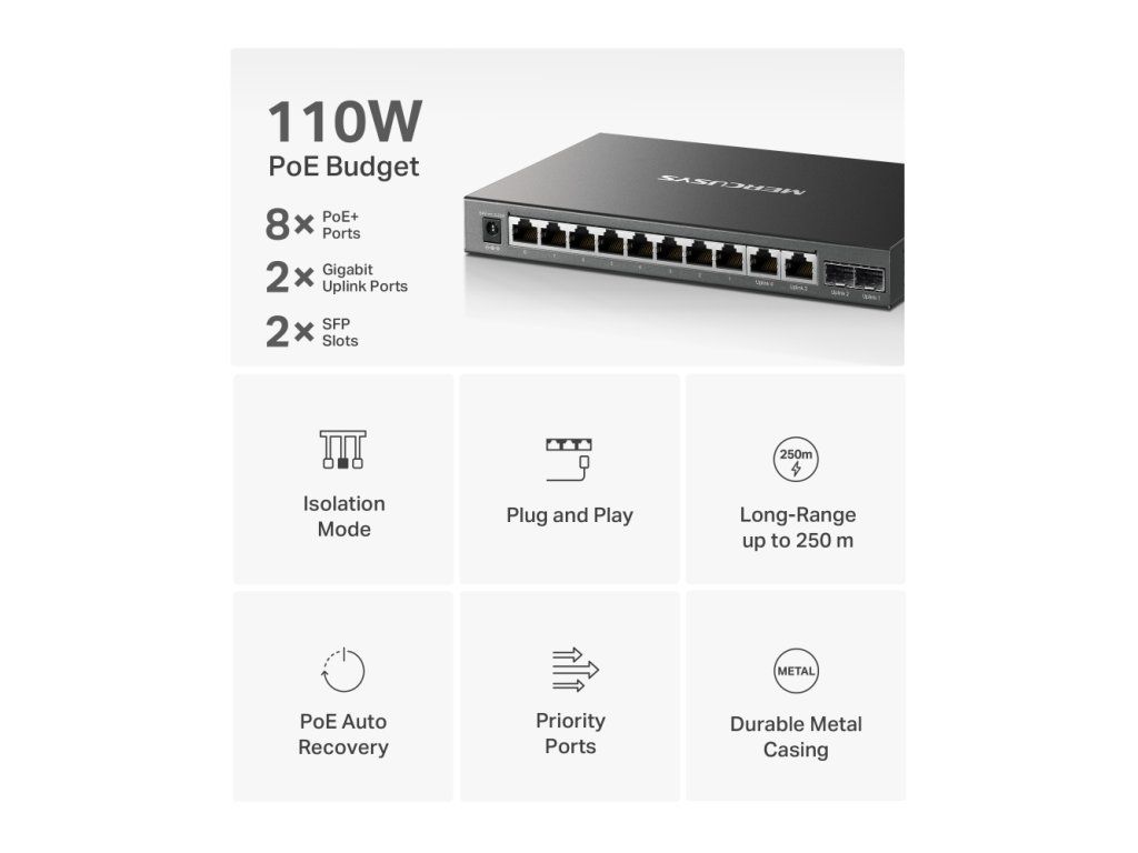 MS112GMP – 12portový Gigabit desktop switch s PoE+Switch nabízí 8× Gigabit PoE+ portů pro přenos dat a napájení jedním kabelem s celkovým rozpočtem 110 W, a 4× Gigabit uplink porty.