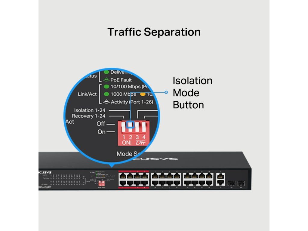 Switch dále nabízí režimy Isolation a Priority pro stabilní a bezpečný provoz a funkci PoE Auto Recovery pro automatický restart neodpovídajících PoE zařízení.