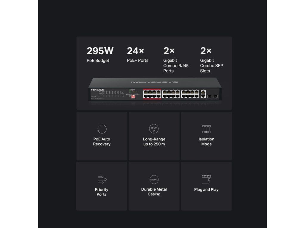MS126CP – 24portový PoE+ rackový switchSwitch nabízí 24× 10/100 Mb/s PoE+ portů, 2× gigabitové combo RJ45 porty a 2× gigabitové combo SFP sloty pro uplink.