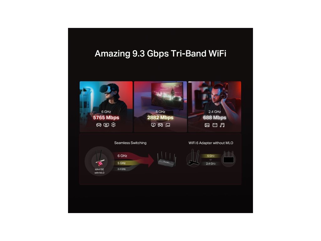 MA47BETřípásmový adaptér BE9300 Wi-Fi 7 s Bluetooth 5.4 vám přináší extrémní rychlosti přenosu a spolehlivé připojení pro všechny vaše zařízení.