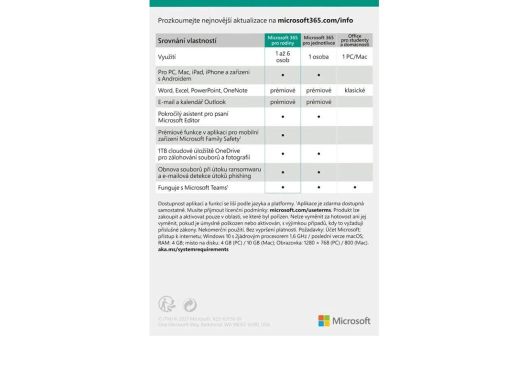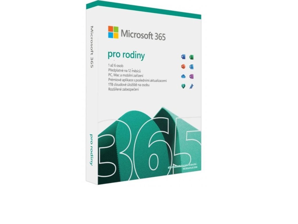 Microsoft 365 Family. Roční předplatné pro až 6 osob, kompatibilní s Windows i macOS. Obsahuje prémiové aplikace Office a rozšířené cloudové služby.SPECIFIKACE