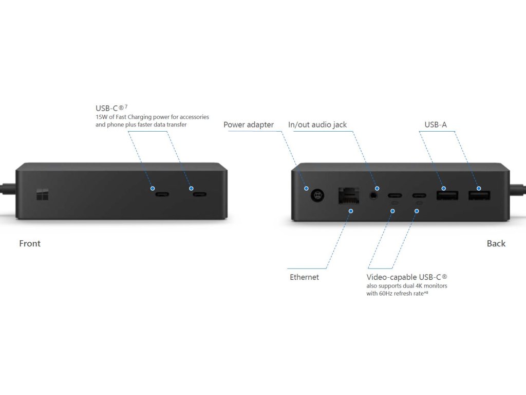 Další informace a srovnání Surface Dock x Surface Dock 2 x USB-C Travel Hub: https://docs.microsoft.com/cs-cz/surface/surface-dock-whats-new