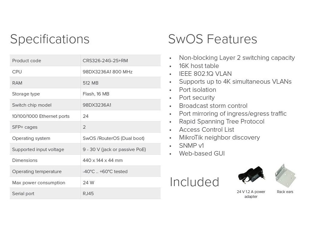 Systémové řešení platforem firmy MikroTik pro poskytovatele bezdrátového připojení k síti Internet.Cloud Router Switch 326-24G-2S+RM je operačním systémem SwOS či RouterOS poháněný 24-portový Gigabitový Ethernet switch s dvěma SFP+ šachtami v 1U rack provedení.