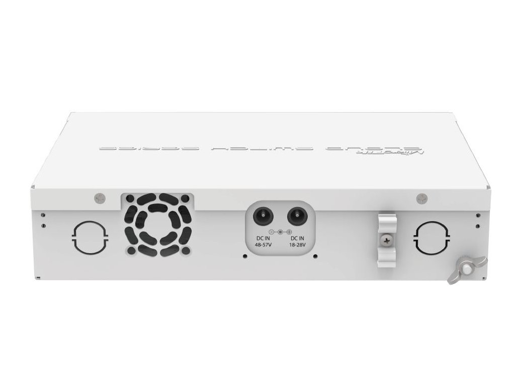 CRS112-8P-4S-IN má na své zadní straně 2 napájecí konektory. První konektor 18 - 28V slouží k připojení přiloženého DC adaptéru a prostřednictvím CRS je pak možné napájet další zařízení připojená do PoE portů pomocí pasivního PoE. Volitelně lze dokoupit napájecí zdroj s napětím v rozmezí 48 - 57V, pak CRS112 umožňuje napájet přes PoE porty zařízení podporující standardy 802.3af/at.