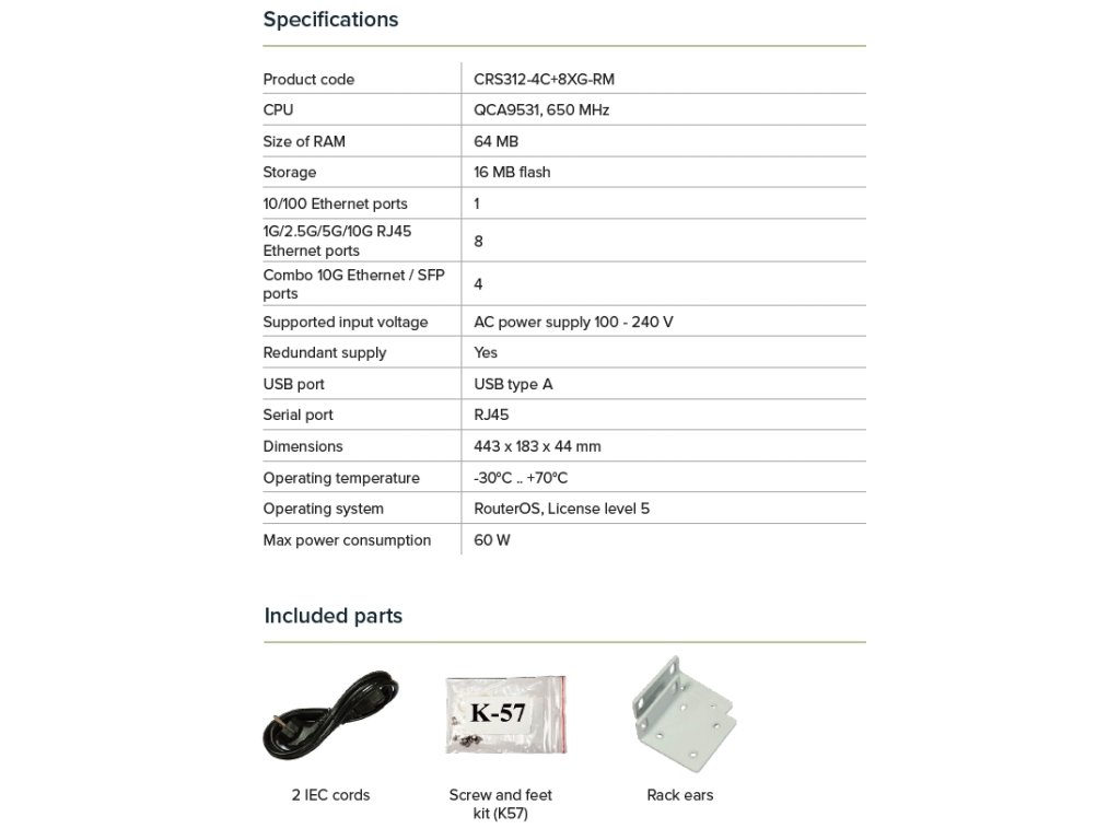 CRS312-4C+8XG-RM dále disponuje redundantním napájením, standardním USB vstupem, konzolovým konfiguračním portem.