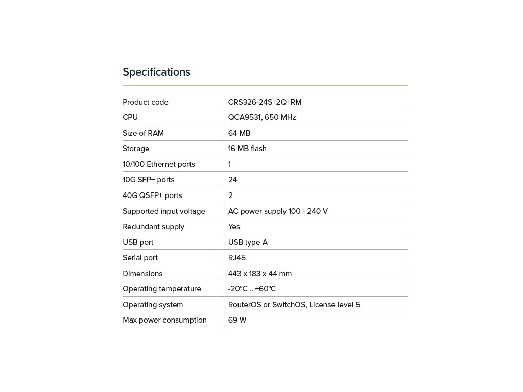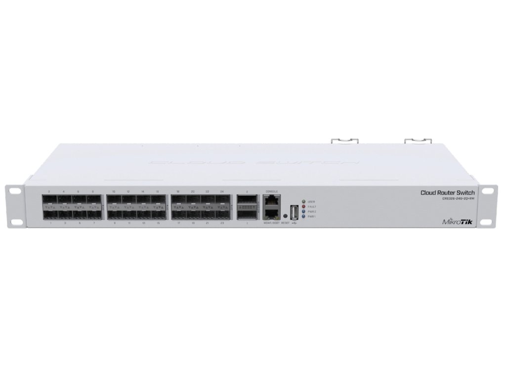 Cloud Router Switch CRS326-24S+2Q+RM je operačním systémem SwOS či RouterOS ("Dual boot") poháněný 26-portový Gigabitový Ethernet switch v rack provedení.Router disponuje dvěma 40Gbps QSFP+ porty a dvaceti čtyřmi 10Gbps SFP+ porty skýtajících propustnost 320 Gbps.