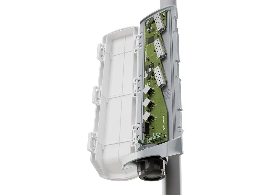 MikroTik venkovní PoE switch GPERx6robustní venkovní switch pro přenos dat a napájení hybridním kabelem na velké vzdálenosti, který omezuje změť kabelů a zjednodušuje instalaci