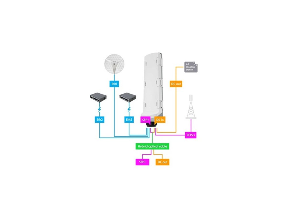 Řešení pro náročné venkovní instalace, kde je potřeba rozdělit data a napájení z jednoho hybridního kabelu na více zařízení. Switch GPERx6 kombinuje 3 Gigabit Ethernet porty s PoE funkcionalitou, 3 vysokorychlostní 10G SFP+ porty pro optické spoje a 3 DC výstupy pro napájení IoT zařízení nebo specializovaných přístrojů.