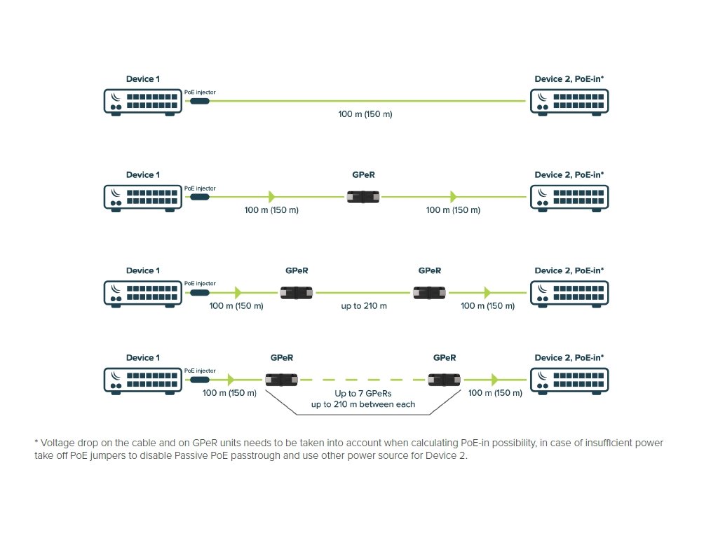 GPeR je součástí Mikrotik GPEN (Gigabit Passive Ethernet Network) konceptu, jež nabízí levnější alternativu k GPON instalacím.Opakovač umožňuje rozšíření dosahu Ethernet sítě o další skok (až <100-150m standardní sítě, až 210m při nasazení další GPeR jednotky) až na 1500m.