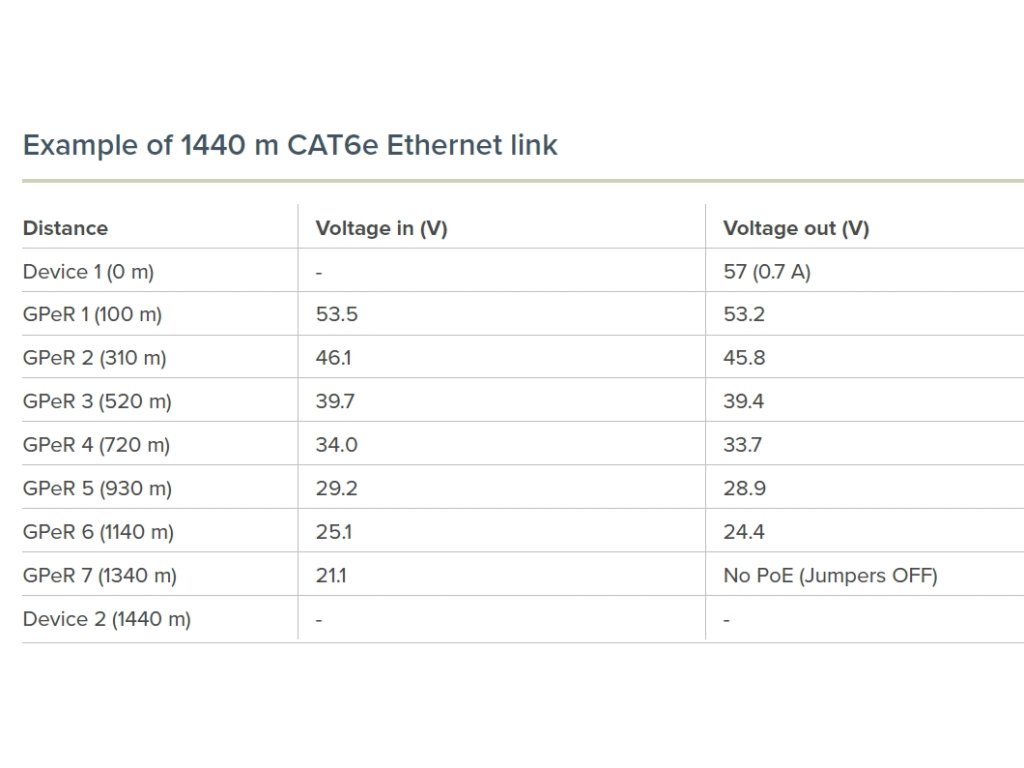 Maximální délka CAT6 Ethernet kabelu mezi GPeR jednotkou a zdrojem napájení/routerem je až 100 až 150m (dle kvality použitého kabelu).