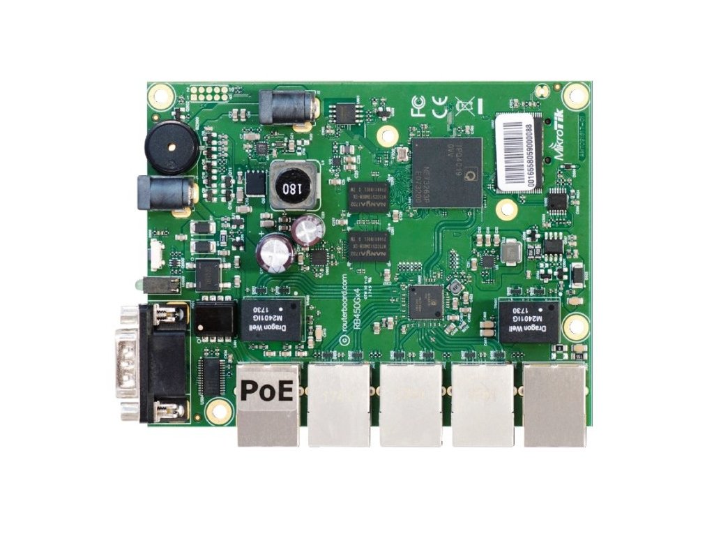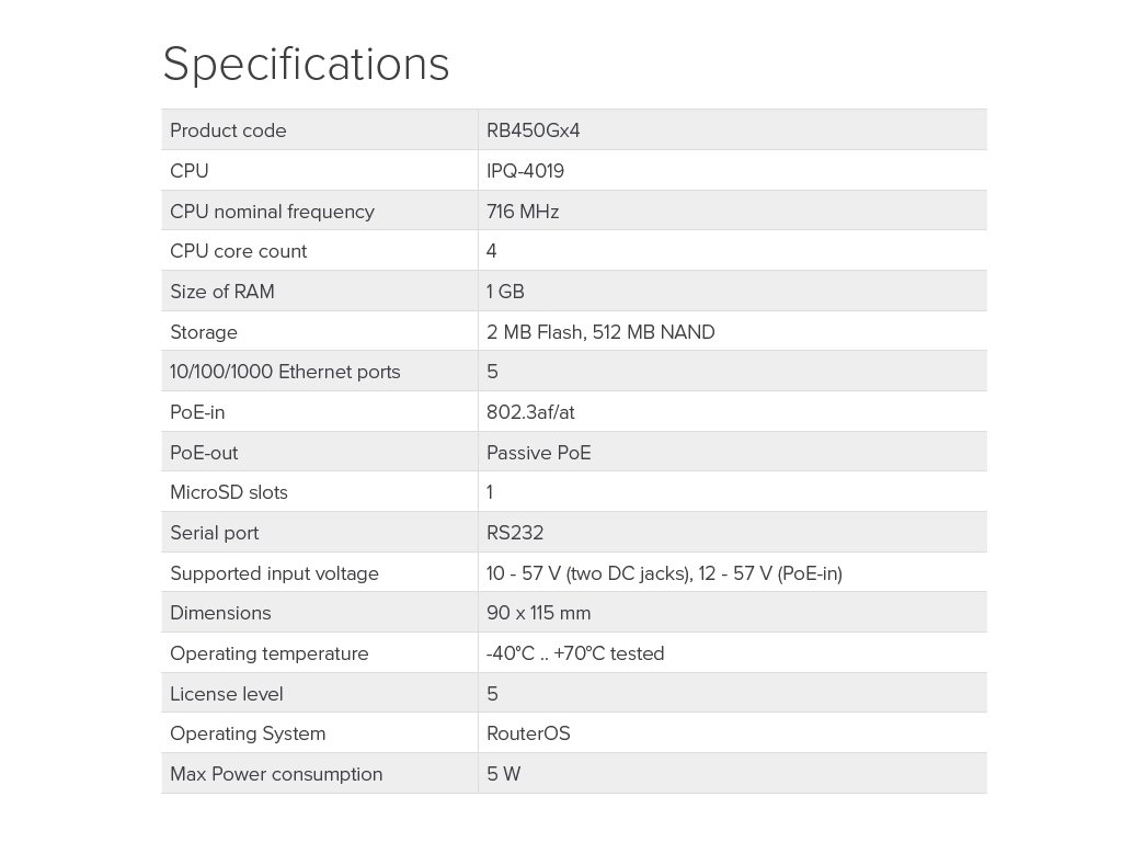 Systémové řešení platforem firmy MikroTik pro poskytovatele bezdrátového připojení k síti Internet.RouterBOARD RB/450G osazený 5x Gigabit LAN rozhraním je poháněn čtyřjádrovým procesorem 716MHZ ARM CPU a disponuje 1GB RAM pamětí.