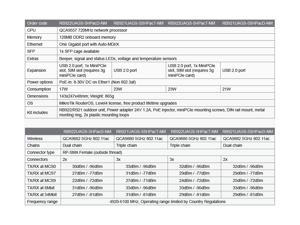 Jednotky jsou dodávány s předinstalovaným a aktivovaným operačním systémem RouterOS V5 L4, součástí dodávky je montážní příslušenství k instalaci na stožár či na DIN lištu, napájecí zdroj 24V s POE