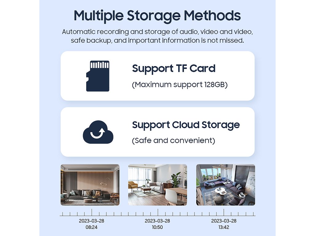•Flexibilní ukládání: Podpora TF karet (4GB-64GB) a cloudového úložiště umožňuje bezpečné a snadné ukládání vašich záznamů.