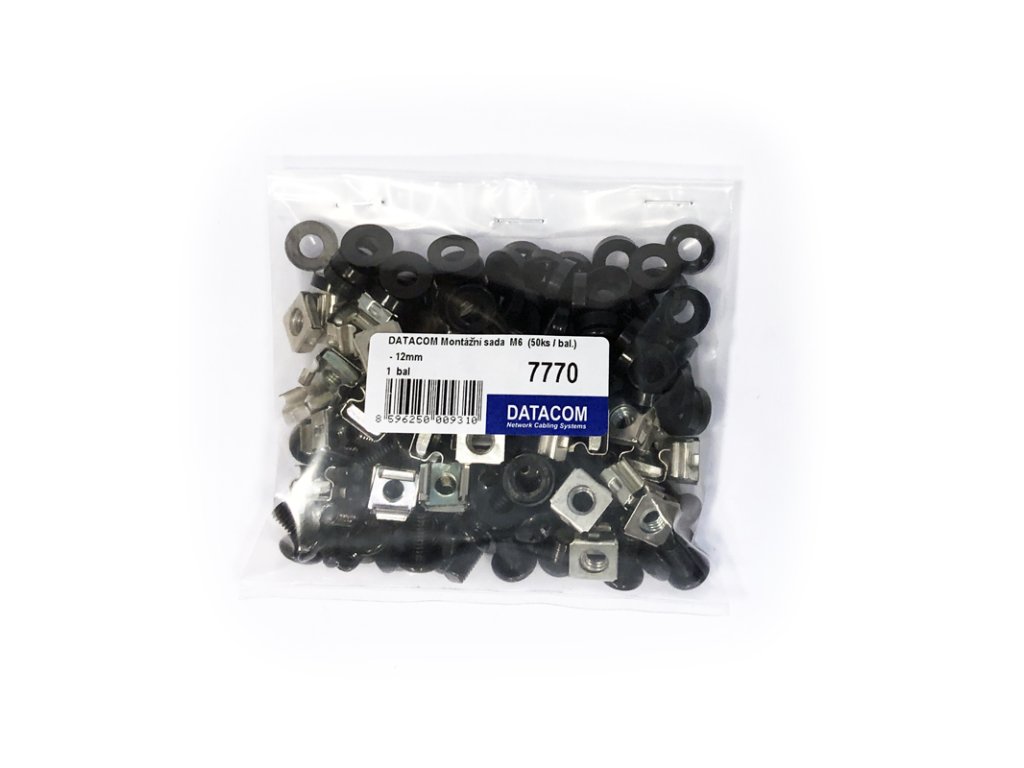 DATACOM Montážní sada M6 (50ks/ bal.) - 12mm BLACKDATACOM Montážní sada M6 je kompletní balení obsahující 50 kusů montážních sad, navržených pro efektivní instalaci a uchycení komponentů do datových rozvaděčů. Tyto montážní sady jsou vhodné pro použití s jakýmkoli typem 10" a 19" datových rozvaděčů, bez ohledu na to, zda se jedná o nástěnné či stojanové varianty.