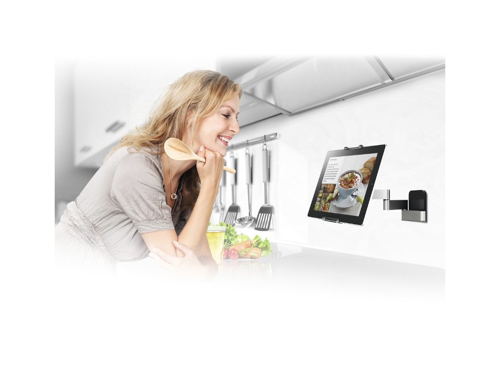 Stylový adaptér vyhovuje všem tabletům o velikosti 7-12" o tloušťce 0,5-1,3 cm. Díky technologii RingO jej můžete snadno uchytit na rameno Flex Mount. Ramenem lze snadno pohybovat, tabletem můžete otáčet, naklánět jej do ideálního pozorovacího úhlu. Nyní můžete hledat recepty, sledovat kuchařské tutorialy nebo vaše oblíbené TV programy i přímo v kuchyni.