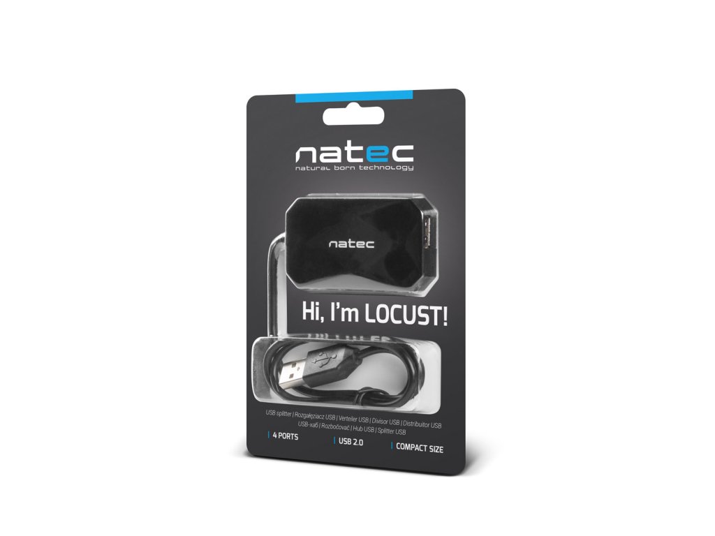 NATEC HUB Locust je vybaven 4 porty USB 2.0, zajistí tak pohodlné užívání potřebných zařízení.Maximální možný přenos dat je 480 Mb/s. Klasický design v černém odstínu.