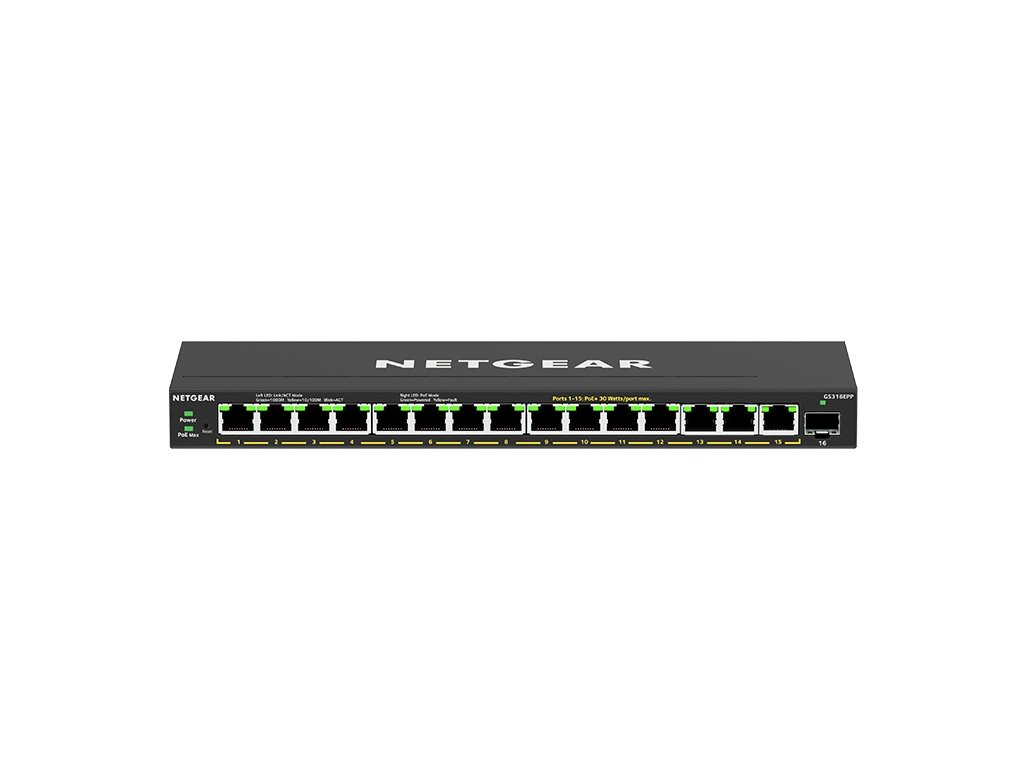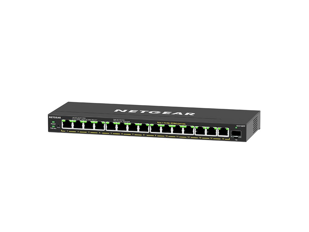 Netgear GS316EPP 16portový přepínač PoE+ Gigabit Ethernet Plus (231 W) s 1 portem SFP. NETGEAR 16-portový switch High-Power PoE+ Gigabit Ethernet Plus poskytuje základní funkce podnikové sítě a napájí zařízení PoE+, jako jsou telefony VoIP, IP kamery a další.*16 portů poskytuje až 1 000 Mb/s vyhrazené neblokující šířky pásma