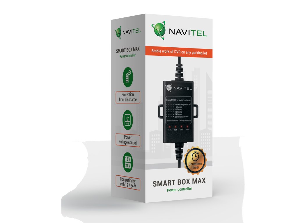 NAVITEL SMART BOX MAX chrání baterii vozidla před úplným vybitím řízení. Adaptér automaticky vypne napájení rekordéru, jakmile napětí baterie klesne na určitou hodnotu nebo uplyne čas stanovený uživatelem (podle toho, co nastane dříve). NAVITEL SMART BOX MAX navíc chrání váš DVR před přepětím.