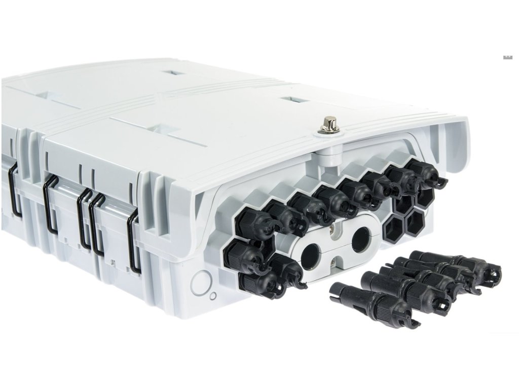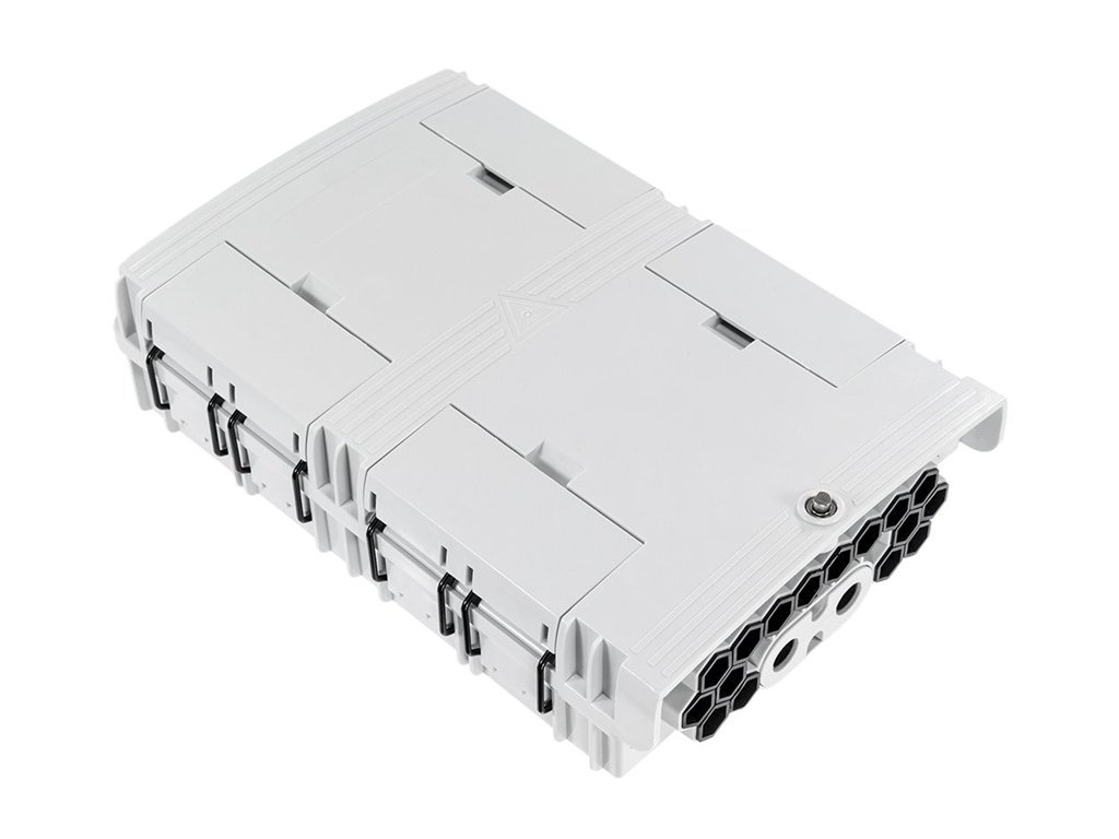 Optický box do pilířového sloupku je vybavený 2 vstupy pro hlavní kabely a 16 výstupními otvory. Sada obsahuje speciální těsnící gumy, které navíc chrání kabely vycházející ze spoje. Uvnitř jsou 3 otočné spojky.