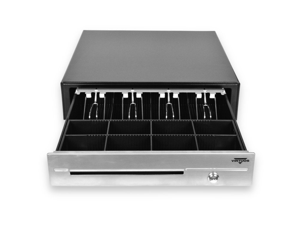 Pokladní zásuvka C430D - s kabelem, kovové držáky, nerez panel, 9-24V, černá