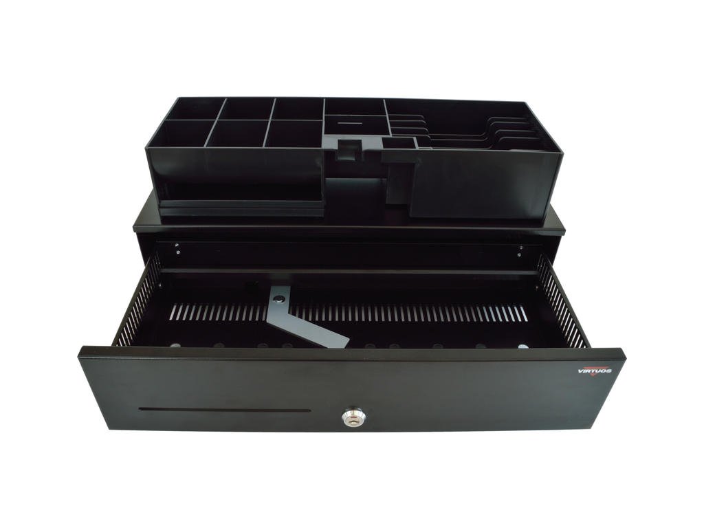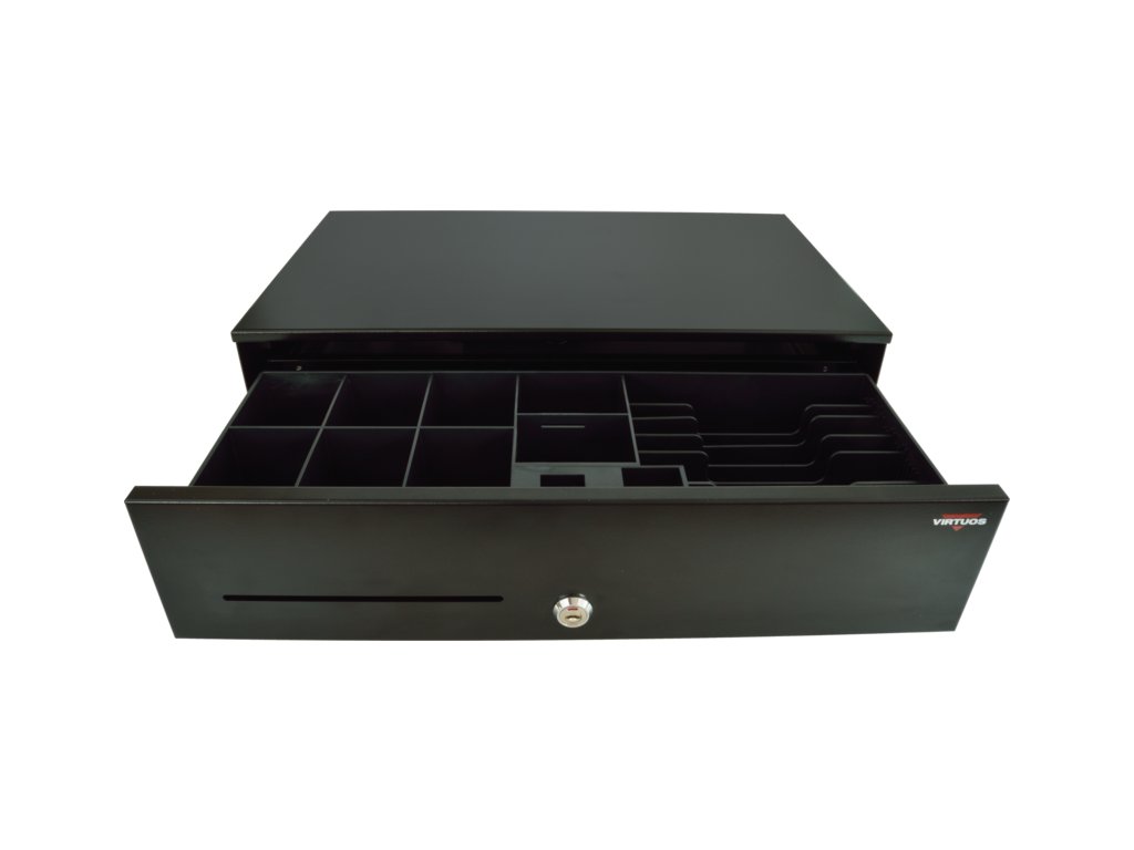 Pokladní zásuvka SK-500C - s kabelem, pořadač 6/8, 9-24V, černáKonektor RJ50, s kabelem RJ12 24V, s předním otvíráním a volitelným rozhraním, 9-24V