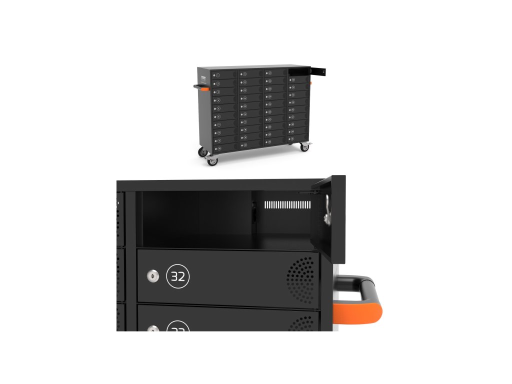 Ergonomické boční madla a všesměrová kolečka s brzdami umožňují snadné přemisťování nabíjecí skříně. Tichá automatická regulace teploty bez ventilátorů vám umožní chladit vaše zařízení při zátěži. Zajišťovací kotevní bod pro kabel nebo řetěz vám umožní skříňku připevnit.