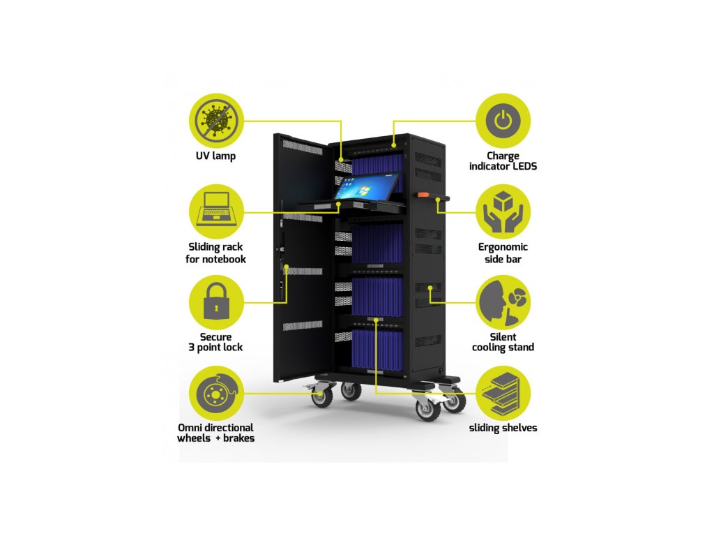 Nejefektivnější řešení pro bezpečné nabíjení až 40 tabletů a 1 notebookuOriginální napájecí skřínka s funkcí dobíjení, kolečky pro transport a bezpečnostním zámkem