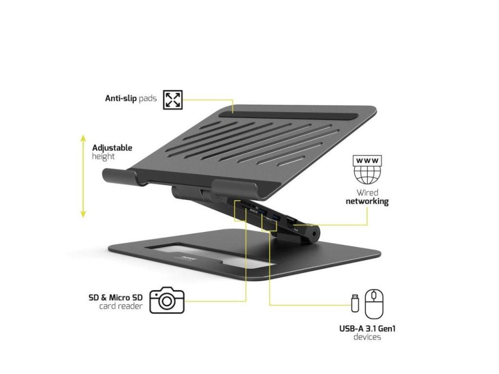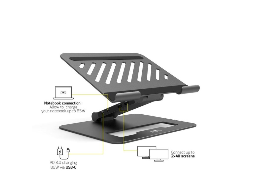PORT CONNECT DOKOVACÍ STANICE USB-C - 2 V 1 s natavitelným stojanem, výkon až 85W, připojení až 7 periferií, přes jeden port USB-C, 2x4K Display port.Plně nastavitelná výška a úhel umožňuje ideální přizpůsobení držení těla a zlepšuje Vaše pohodlí.
