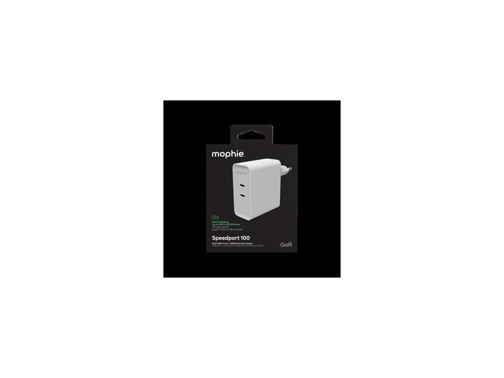 Mophie Speedport 100 – výkonná GaN nabíječka s výkonem 100 WNabíjejte svá zařízení rychleji a efektivněji s Mophie Speedport 100 . Tento adaptér nabízí dva USB-C PD porty s celkovým výkonem až 100 W , což znamená, že iPhone nabijete na 50 % za pouhých 30 minut . Ideální pro telefony, tablety i notebooky.