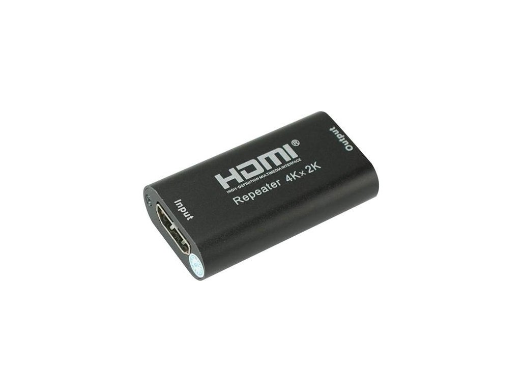 HDMI repeater, opakovač 4K HDMI signálu až do 40m- Zapojuje se většinou do prostřed trasy mezi dva kabely, například mezi dva 20m kabely,viz příklad zapojení níže, proto konektory repeateru jsou female-female ( doporučené provedení 20m HDMI kabelu, měděný vodič 24AWG )