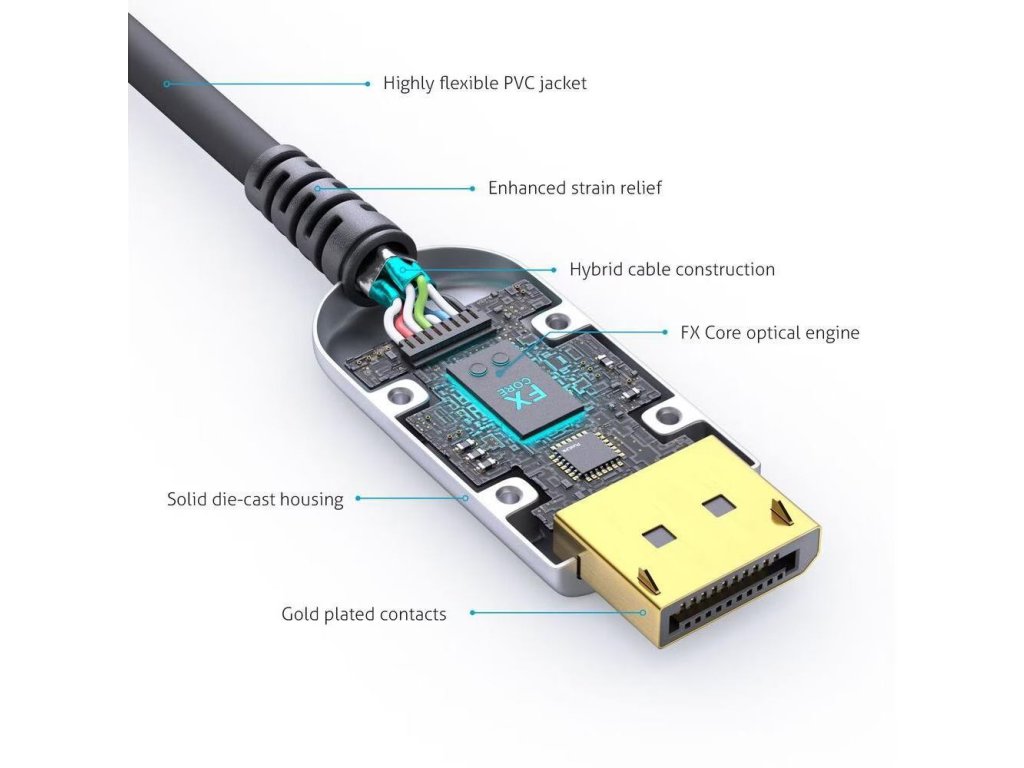- optický kabel převádí elektrické datové signály na optické a zpět na elektrické signály, v konektorech je integrován speciální chip, proto je kabel jednosměrný a konektory jsou označeny SOUCE a DISPLAY