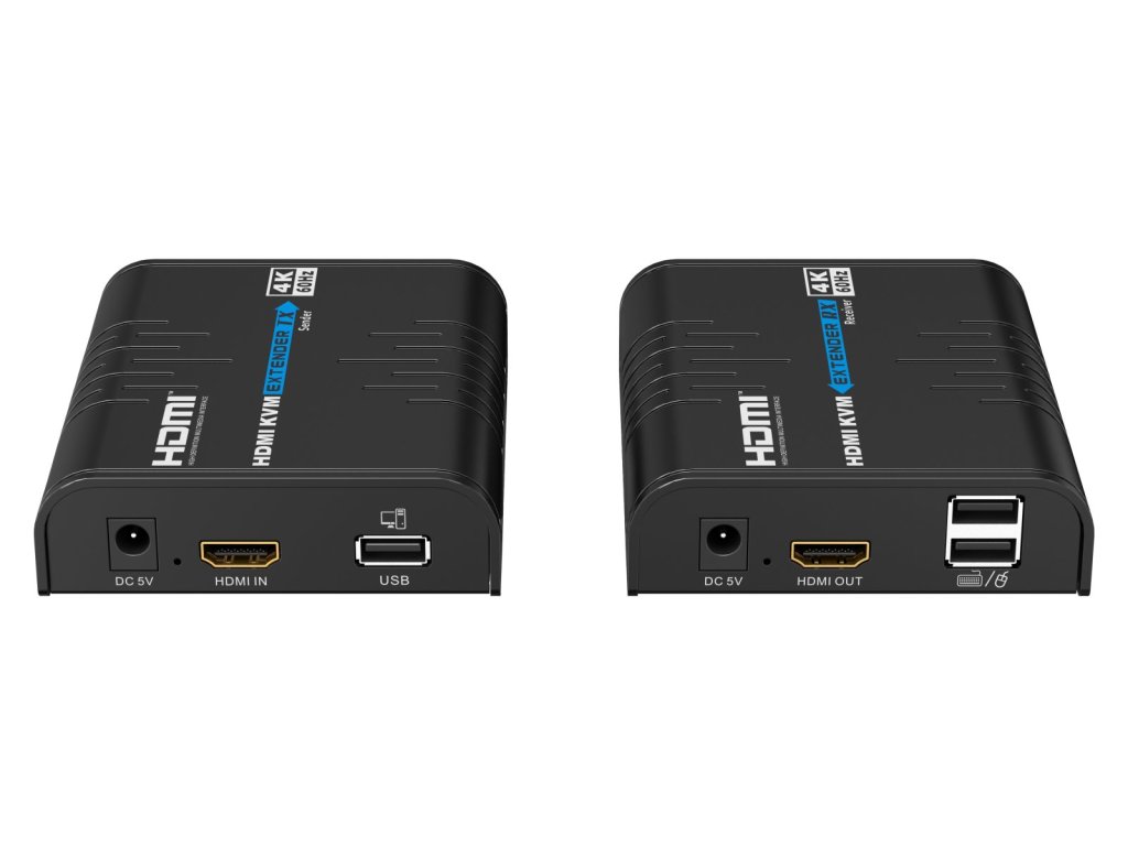 - Extender přenáší také USB, vysílač má jeden USB pro zapojení do počítače, přijímač má dva USB konektory pro zapojení například myši, klávesnice nebo dotykové obrazovky