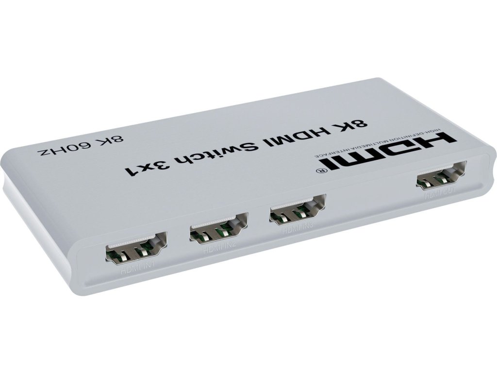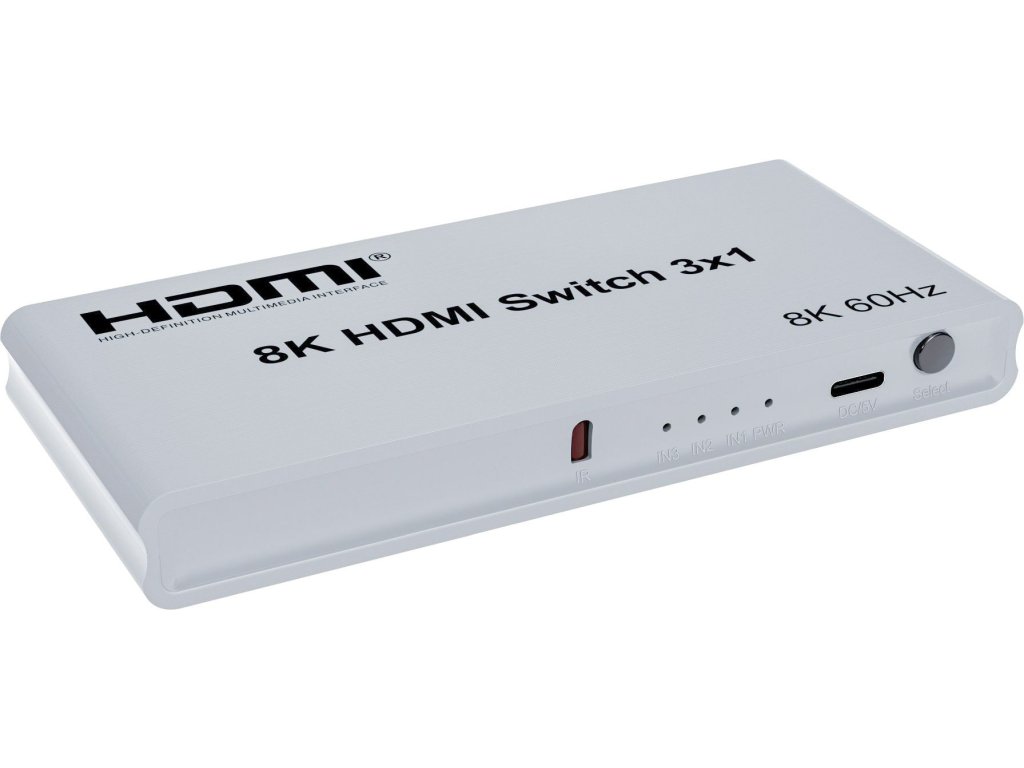 PremiumCord 8K@60Hz, 4K@144Hz HDMI switch 3:1 s dálkovým ovladačem3 HDMI zařízení na vstupu sdílejí 1 výstupní monitor, projektor. Výběr vstupních zařízení: 1.automaticky, 2.stisknutím tlačítka na čele přepínače, 3.dálkovým ovladačem