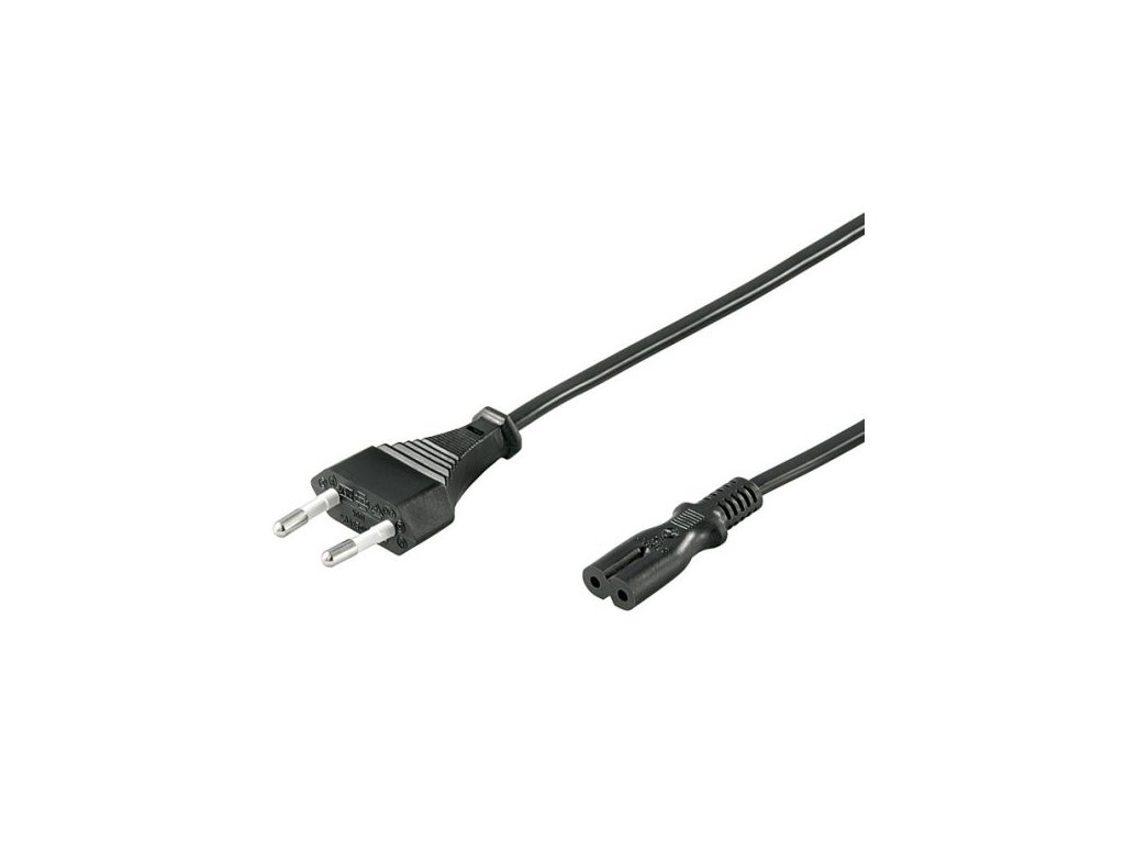 Napájecí kabel v černém provedení pro napájecí adaptér. Dvoužilový kabel je zakončený koncem v podobě ležaté osmičky.První konektor: Euro male (Type C CEE 7/16)